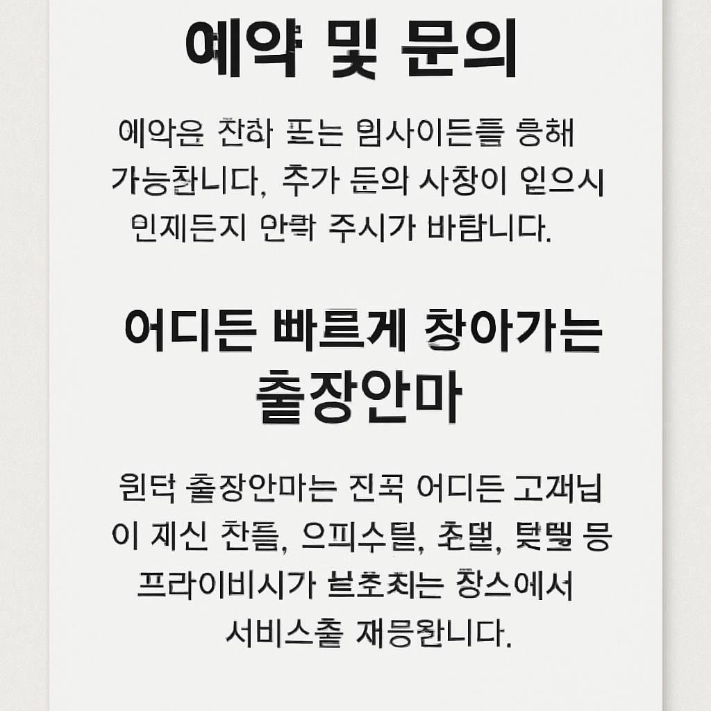 예약 후 취소가 필요한 경우, 서로의 편리를 위해 안마기사가 떠나기전 얘기해주세요.(예약취소 여러번 반복되면 블랙리스트에 들어갈수도 있습니다.)